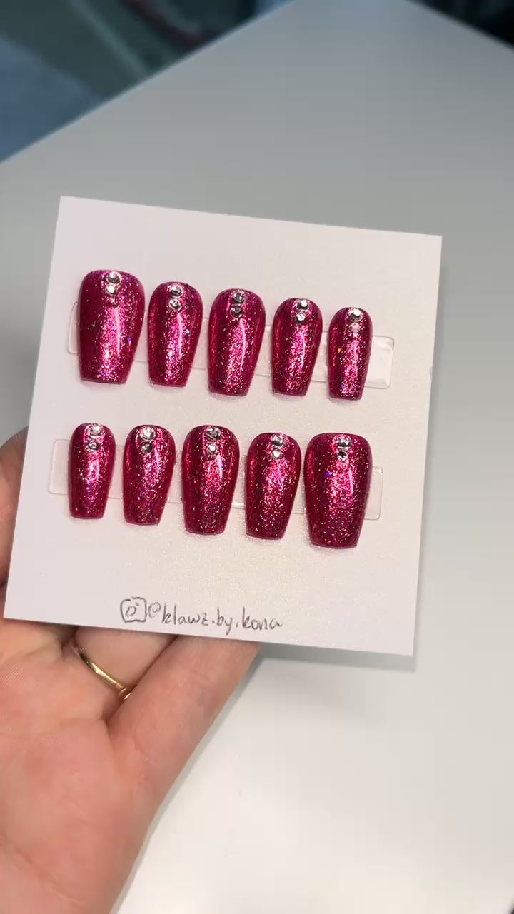 Absolutely THE MOST sparkly you can get hot pink nails! This set is made with high quality nail polish, jam packed silver & hot pink metallic flakes, with an added pink diamond gem touch on each nail!💓