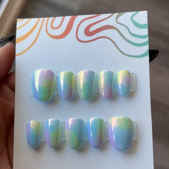 Made with a hand blended gradient background of all pastel colors, and topped with a beautiful multi-chromatic shimmer powder to create this gorgeous opal effect! This set has many intricate layers of blending that allow this effect to shine! Every angle features different colors!🌟